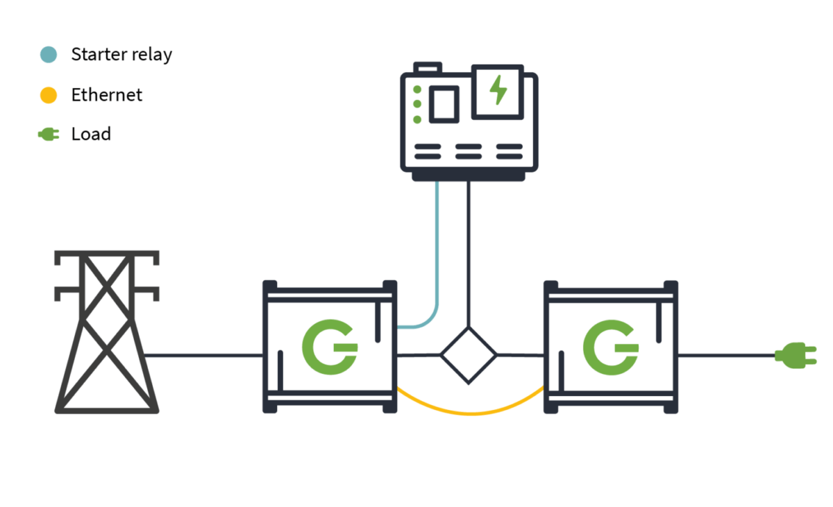 This is a setup whereby two batteries are placed in series. The input of the first battery can be connected to a grid, genset, or no energy source at all. Sometimes an additional genset is placed in between both batteries, like in this example. An ethernet cable allows for a data connection between both batteries. The aim of this setup is to let both batteries charge and discharge at a similar rate, thereby mimicking a battery with double the capacity. This is achieved by letting the second battery leveling its state of charge with that of the first battery by continuously controlling the amount of power it takes from the first battery based on the state of charge and charging rate data both batteries exchange.