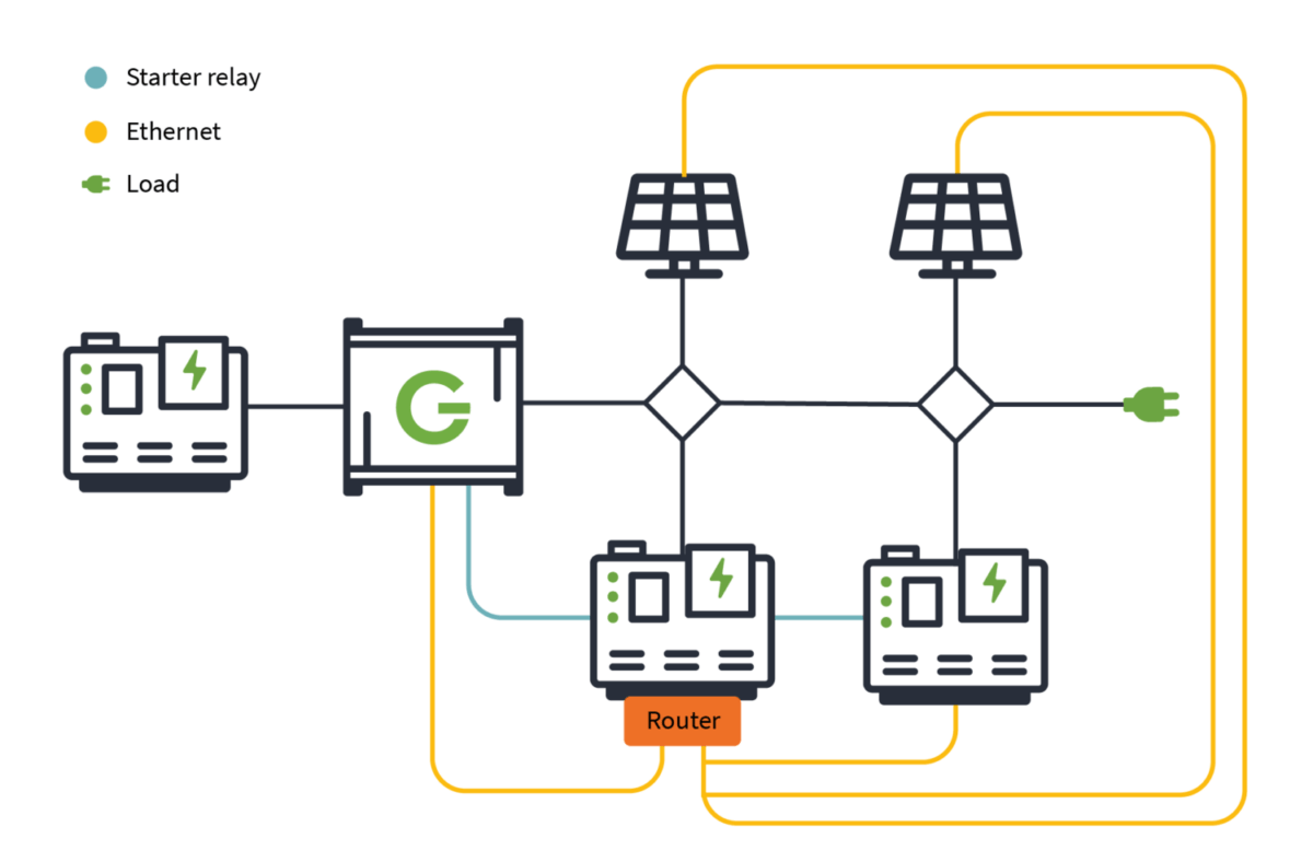 This is a set-up where we power the venue through solar power and a single cycling genset on the input of the battery. In case of high demand or genset failure, the two gensets on the output will take over the load. The gensets are started via a starter relay, but we are also directly connected to the modbus servers of both gensets and solar inverters through the router of one of the gensets. This allows us to monitor the energy production of each individual asset and to curtail the solar inverters in times of low demand. This setup demonstrates the versatility of the EMS, whereby it has the responsibility of controlling the power management of six different assets.