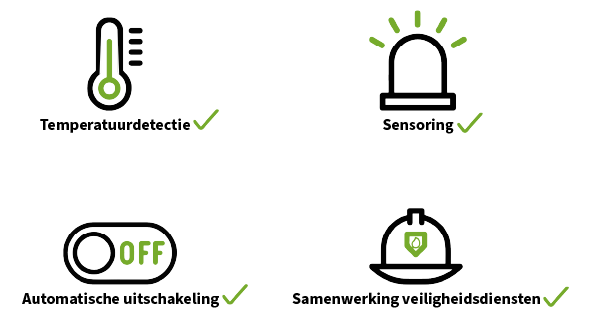 One of the biggest concerns we receive from the field about the use of battery installations is a so-called thermal runaway: a battery fire. With a thermal runaway an exothermic reaction (burning without oxygen) takes place in which the batteries heat up very quickly (>10 degrees/minute). The consequence of this almost unstoppable chain reaction is the melting or even exploding of the battery and the burning of the substances and gases that are released. It is important to emphasize that the chance of this happening in practice is very small. Various precautions are possible to minimize the risk of fire. With regard to fire safety, we use a way of working that is based on four main components: prevention, detection, fire fighting and impact limitation.