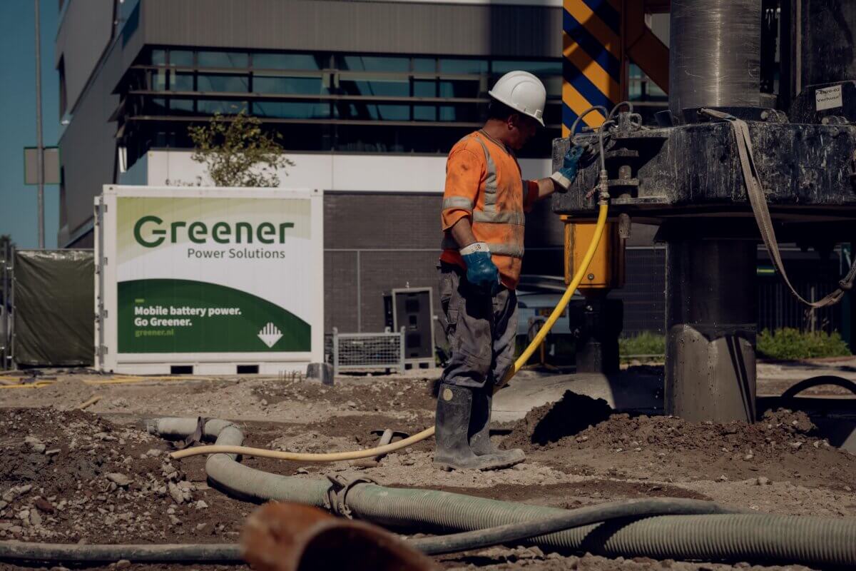 Afortunadamente, siempre hay una opción sostenible. Fundex utiliza una potente perforadora eléctrica para crear los cimientos. Requiere una potencia de 1200-1500 kWh al día, lo que equivale al consumo diario de electricidad de unos 150 hogares. Es una perforadora muy grande. Tan grande que necesitamos tres baterías Greener, cada una con una capacidad de 422 kWh, para suministrarle la energía suficiente.